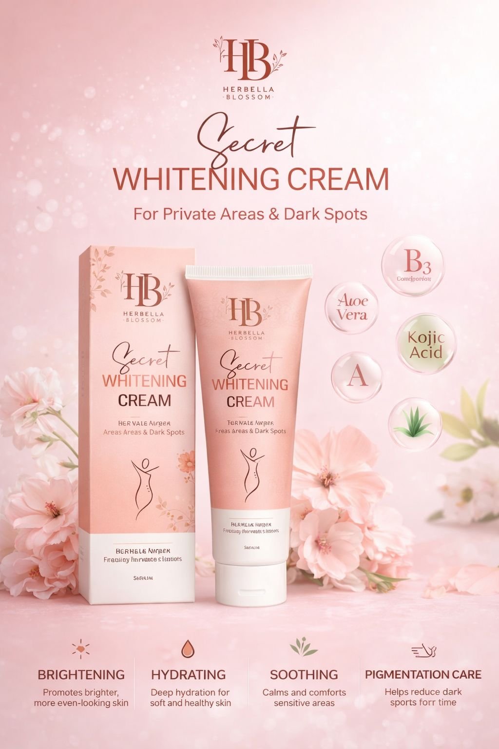 Herbella Blossom Secret Whitening Cream is specially formulated for private areas, underarms, and dark spots. Its gentle, nourishing formula helps gradually lighten uneven pigmentation while keeping your skin safe and healthy. Lightweight and non-greasy, it absorbs quickly, leaving your skin feeling soft, smooth, and refreshed. With regular use, skin texture improves and dark areas appear visibly brighter.